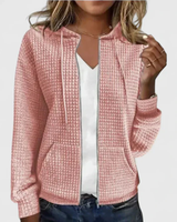 Ce sweat à capuche décontracté allie confort et design épuré et moderne. Avec sa finition texturée, sa fermeture éclair sur toute la longueur et sa capuche à cordon, il est parfait pour les matins frais, les week-ends décontractés ou les jours de voyage.