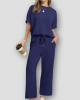 Conçu avec un tissu doux et respirant, cet ensemble t’offre une sensation de légèreté sur la peau. Le top à manches courtes et le pantalon à taille élastique s’adaptent parfaitement à ta silhouette, pour un confort absolu toute la journée.